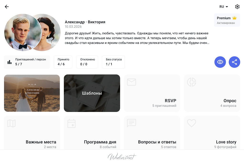 Выбор и настройка шаблонов, списки гостей и опросы. Возможность создания мультиязычных приглашений.